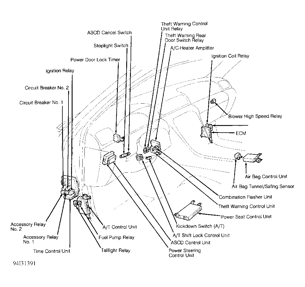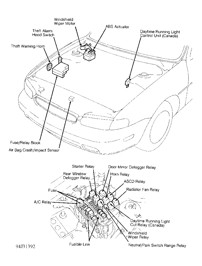 | Headlamp Control Relay Unit | At left rear of engine compartment, under cruise control, near hood hinge. |