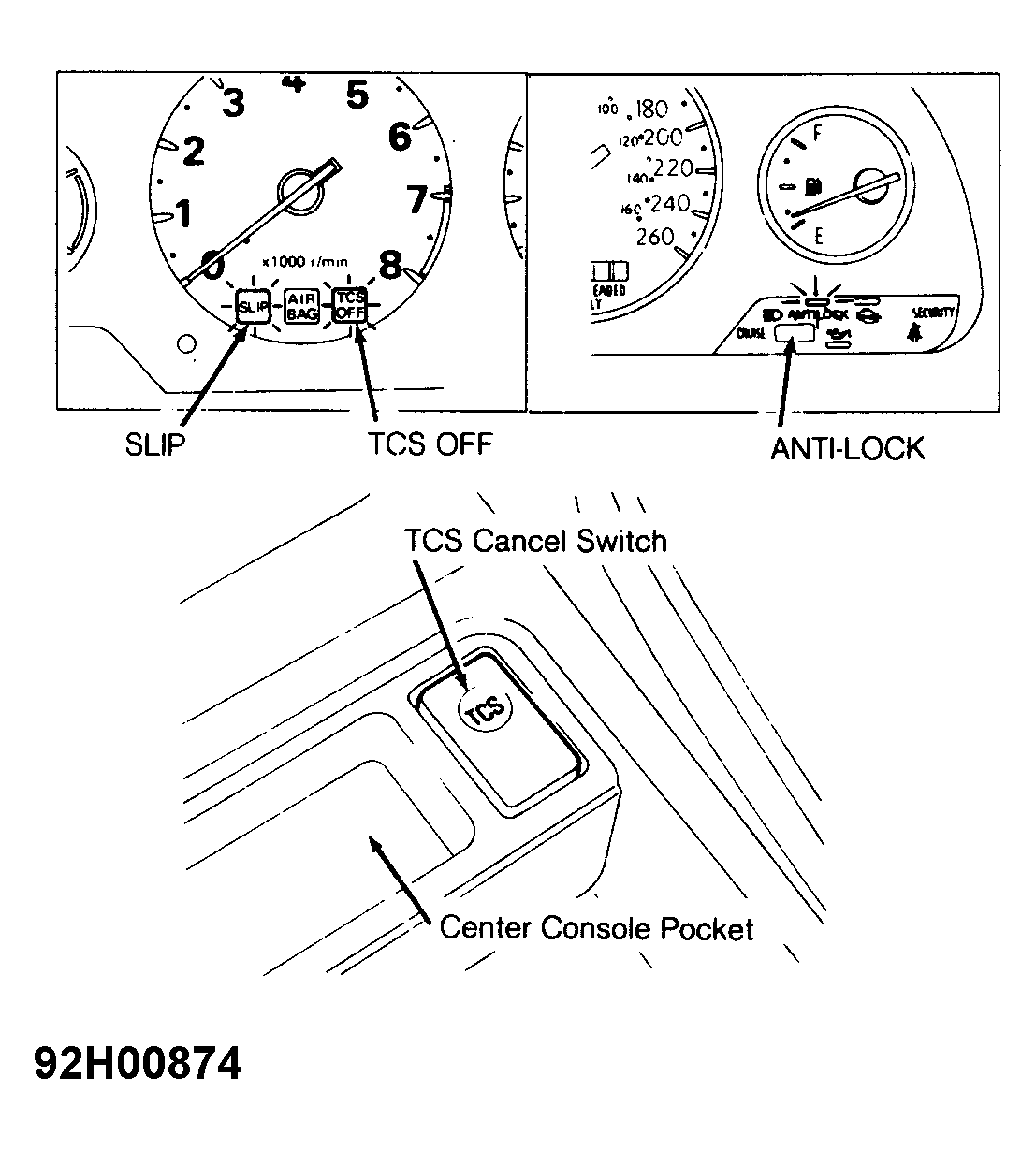 TCS control unit also possesses an ABS function. In addition, TCS control unit possesses self-diagnosis and fail-safe functions. When a fault is detected, system releases its control over throttle and brakes. SLIP and TCS OFF indicators and/or ABS warning lamps light up and the LED flashes number of times corresponding to the fault location. See Figure , Figure , Figure and Figure .