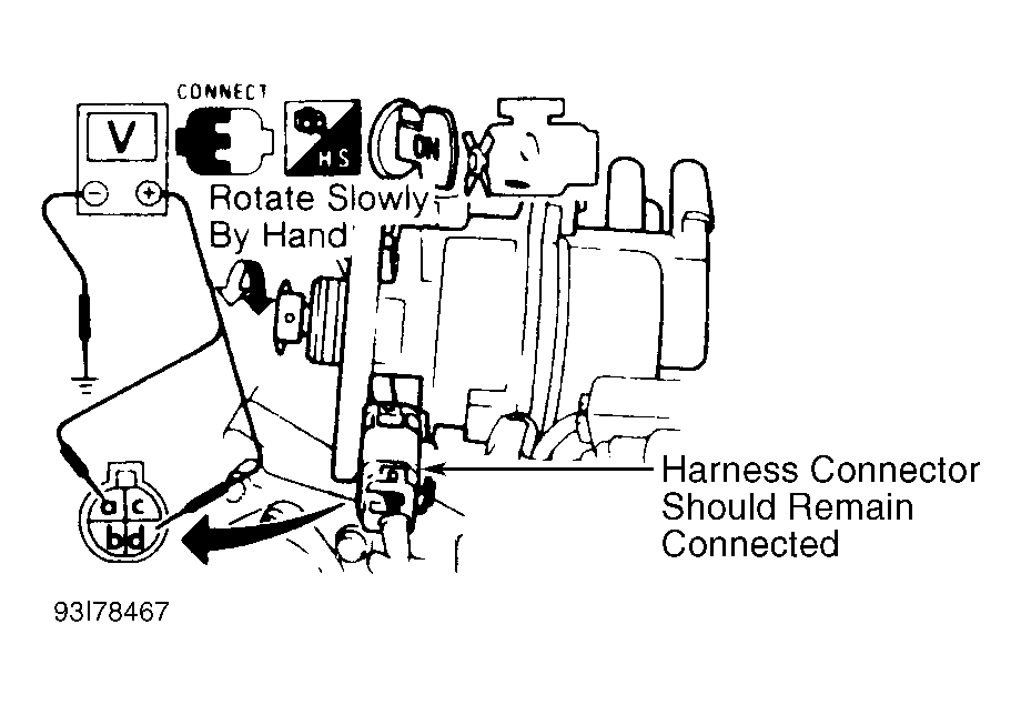 1. Remove distributor (with internal crankshaft position sensor) from engine. DO NOT  disconnect crankshaft position sensor harness connector. Turn ignition on. 2) Connect negative lead of an analog voltmeter to ground. Rotate crank angle sensor shaft slowly by hand. Connect positive voltmeter lead to crankshaft position sensor connector terminal "a" (180-degree signal). See Fig 1 . Voltage should fluctuate between zero and 5 volts. Move voltmeter positive lead to terminal "d" (one-degree signal). Voltage should again fluctuate between zero and 5 volts.