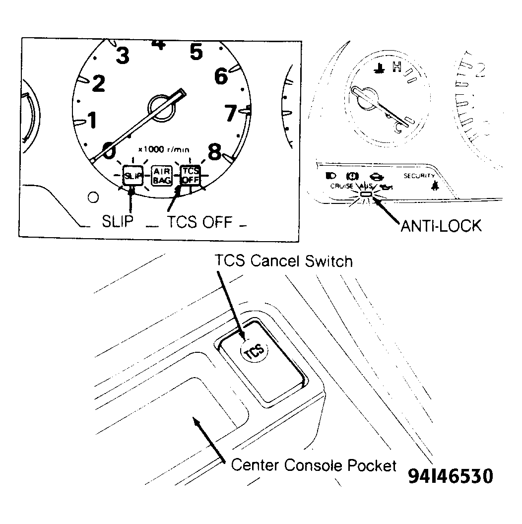 TCS control unit also possesses an ABS function. In addition, TCS control unit possesses self-diagnosis and fail-safe functions. When a fault is detected, system releases its control over throttle and brakes. SLIP and TCS OFF indicators and/or ABS warning lamps light up and the LED flashes number of times corresponding to fault location. See Figure and Fig 1- Figure .