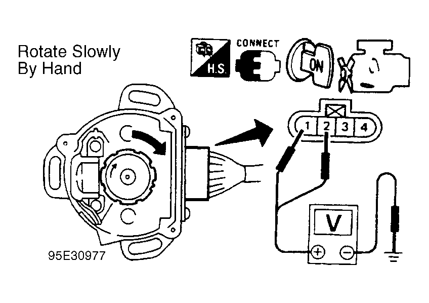 2. Connect negative lead of an analog voltmeter to ground. Rotate camshaft position sensor shaft slowly by hand. Connect positive voltmeter lead to camshaft position sensor connector terminal No. 1 (90-degree signal). Voltage should fluctuate between zero and 5 volts. Move voltmeter positive lead to terminal No. 2 (one-degree signal). Voltage should again fluctuate between zero and 5 volts. See Fig 1 .