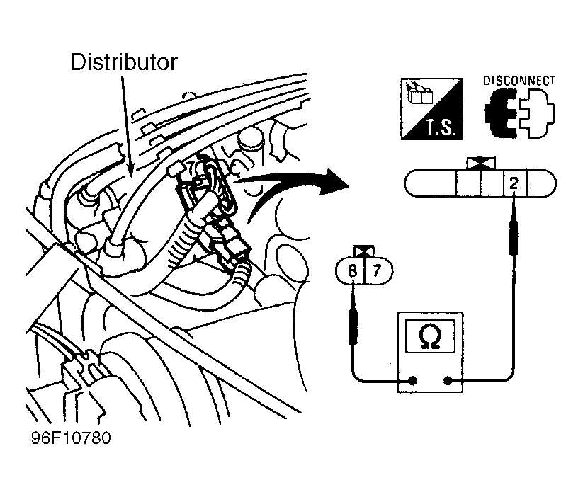 Disconnect ignition coil and power transistor harness connector from distributor. Using ohmmeter, check for continuity between power transistor connector terminal No. 2 and ignition coil connector terminal No. 8. See Fig 1 . If continuity is not present, replace distributor.