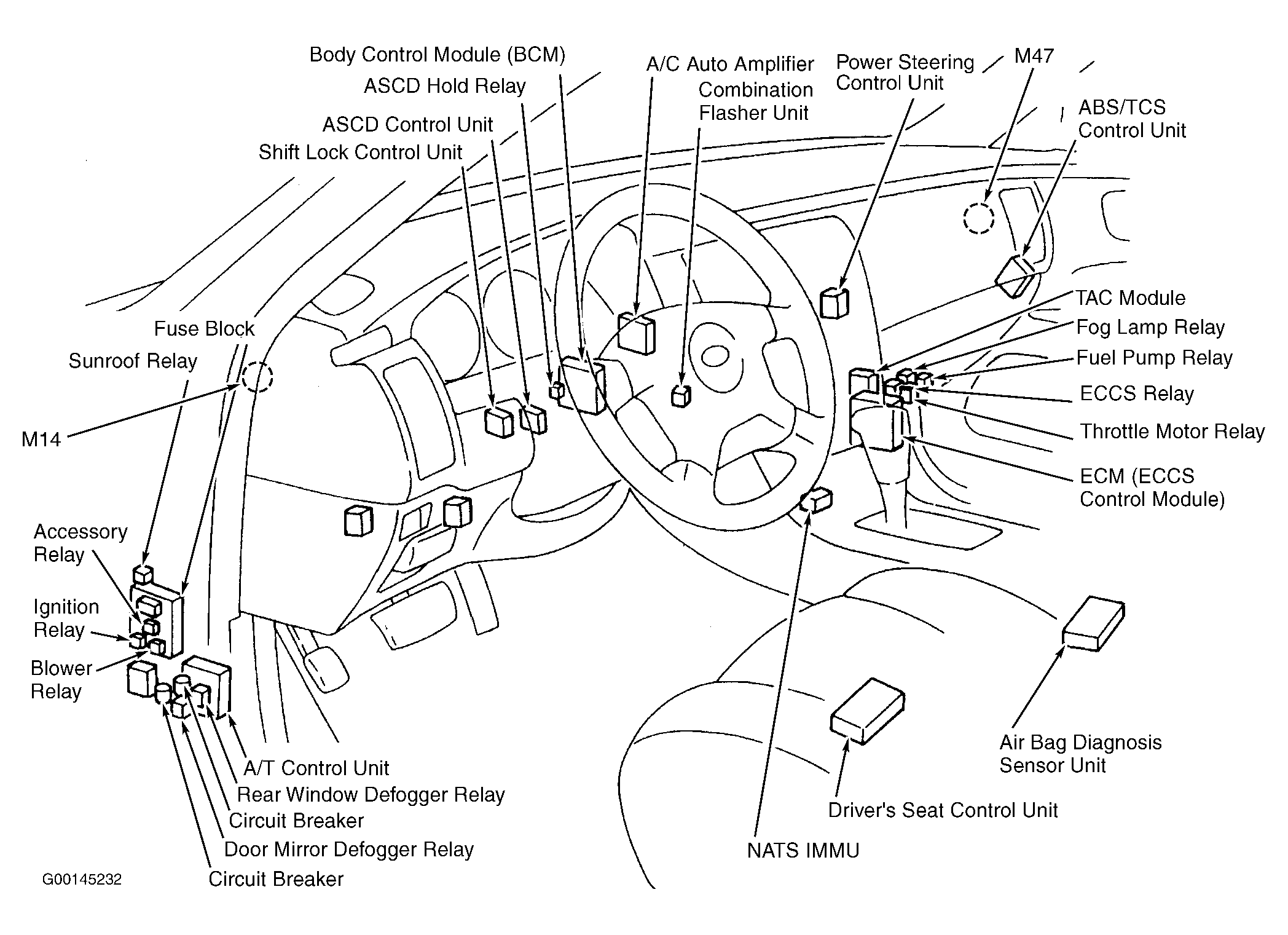 ASCD Control Unit Behind dash, left of steering column. See Figure .