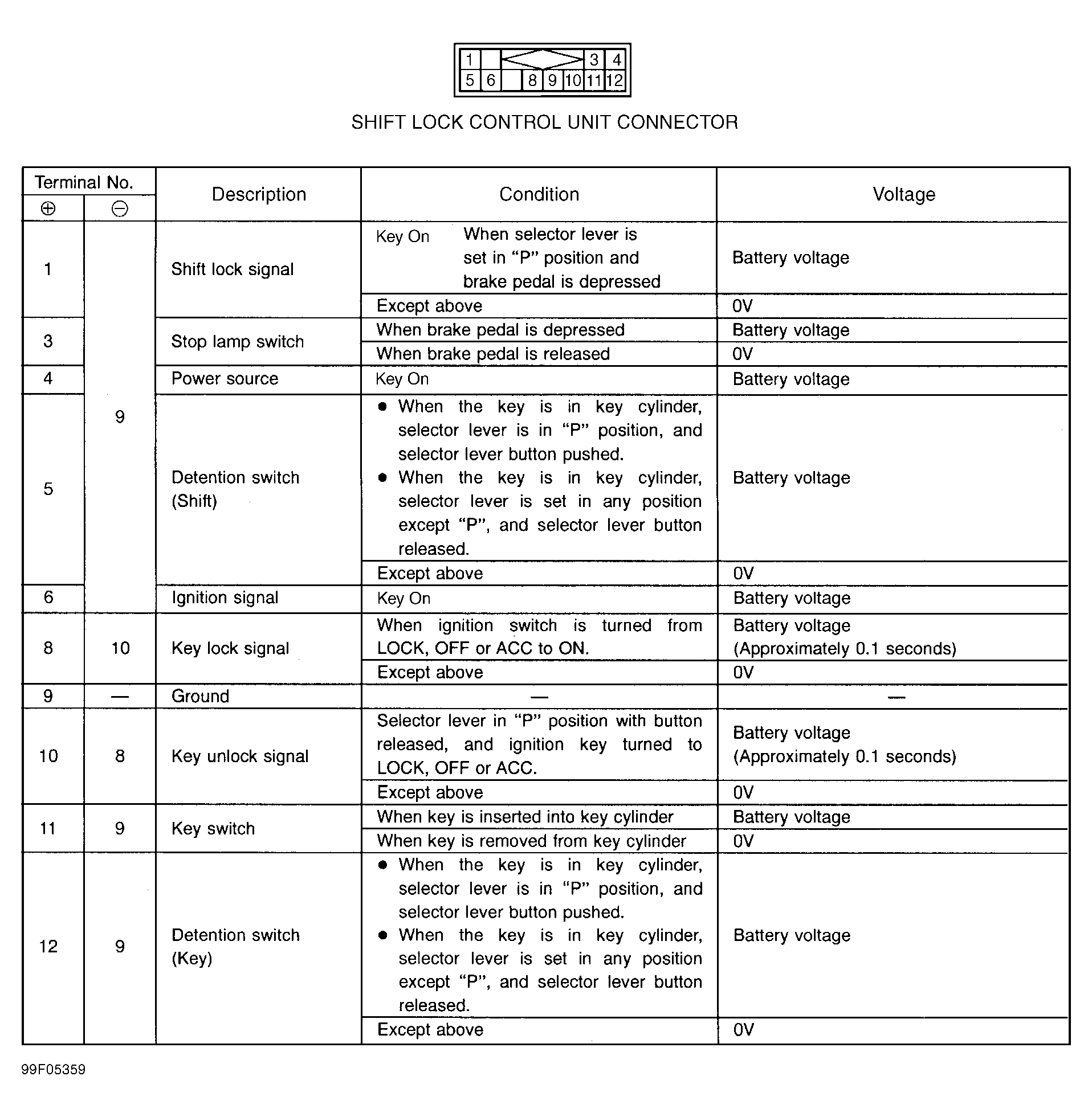 Using voltmeter, backprobe Shift Lock Control Unit (SLCU) connector. Measure voltage between SLCU terminals. See Fig 1 .