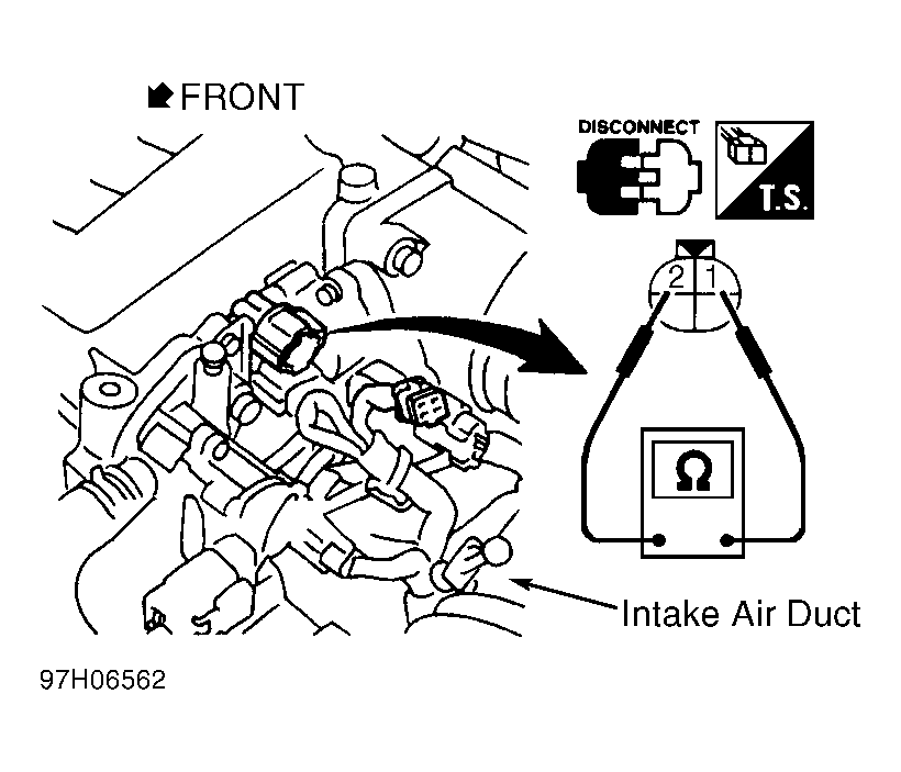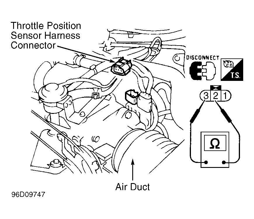 1. Ensure engine is warmed to normal operating temperature. Disconnect throttle position sensor harness connector. See Fig 1 or Fig 2 . On I30, check resistance between connector terminals No. 2 and 3. On Q45, check resistance between connector terminals No. 1 and 2.