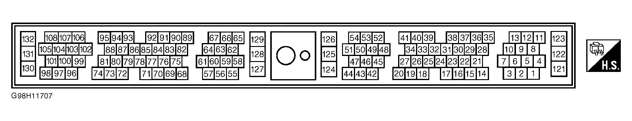 . If battery voltage is present at all terminals, go to next step. If battery voltage is not present at all terminals, check fusible link, fuse "G" and wiring. Repair as necessary.