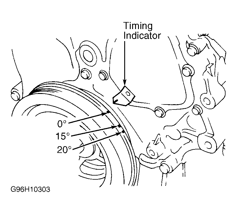 2. Check ignition timing. See V6 IGNITION TIMING  table. See Figure. If ignition timing is incorrect, loosen hold-down bolt and turn camshaft position sensor to adjust timing. Tighten camshaft position hold-down bolt. Recheck ignition timing.