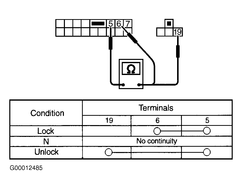 3. Disconnect driver's door lock/unlock switch connector. Check continuity between specified terminals. See Fig 1 . Replace switch as needed. If switch is okay, inspect the following: