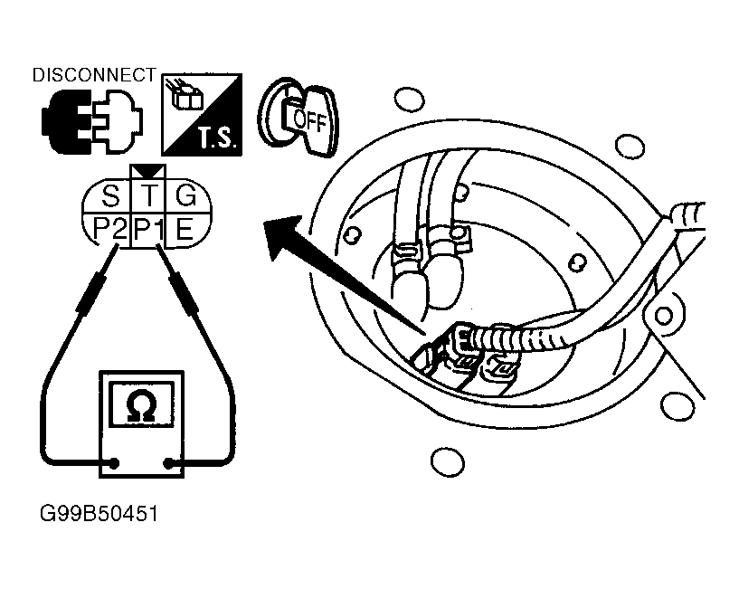Disconnect fuel pump harness connector. For location, see FUEL PUMP HARNESS CONNECTOR LOCATIONS table. On Frontier and Xterra 4-cylinder models, measure resistance between fuel pump connector terminals P1 and P2. See Fig 1. On Maxima and Sentra, measure resistance between fuel pump connector terminals No. 1 and 3. See Fig 2. On Quest, measure resistance between fuel pump connector terminals No. 2 and 3. See Fig 3. On all models except Frontier and Xterra 4-cylinder models, Maxima, Quest and Sentra, measure resistance between fuel pump 2-pin connector terminals. On all models, resistance should be 0.2-5.0 ohms at 77°F (25°C). Replace fuel pump, if resistance is not as specified.