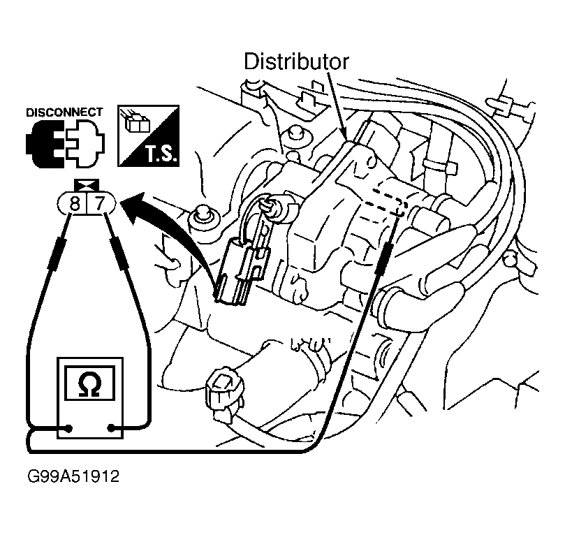 Ignition coil is located in distributor. Turn ignition off. Disconnect distributor 2-pin harness connector (ignition coil connector). Remove distributor cap. For primary coil, measure resistance between distributor 2-pin connector terminals (component side). For secondary coil, measure resistance between distributor 2-pin connector terminal No. 7 and coil tower. See Fig 1. See IGNITION COIL RESISTANCE  table. Replace distributor assembly, if resistance is not as specified.