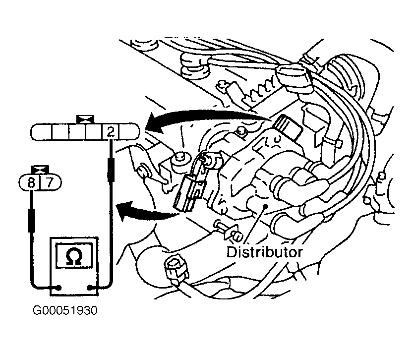 Power transistor is located in distributor. Turn ignition off. Disconnect distributor 2-pin and 6-pin harness connectors. Measure resistance between distributor 2-pin connector terminal No. 8 and distributor 6-pin connector terminal No. 2 (component side). See Fig 1. If resistance is zero ohms, replace distributor assembly. If resistance is not zero ohms, power transistor is okay.