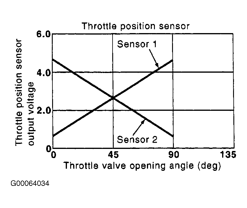 Electric Throttle Control Actuator consists of throttle control motor, Throttle Position (TP) sensor, etc. The TP sensor responds to the throttle valve movement. The TP sensor has the 2 sensors. These sensors are a kind of potentiometers which transform the throttle valve position into output voltage, and emit the voltage signal to the ECM. See Figure . In addition, these sensors detect the opening and closing speed of the throttle valve and feed the voltage signals to the ECM. The ECM judges the current opening angle of the throttle valve from these signals and the ECM controls the throttle control motor to make the throttle valve opening angle properly in response to driving condition.