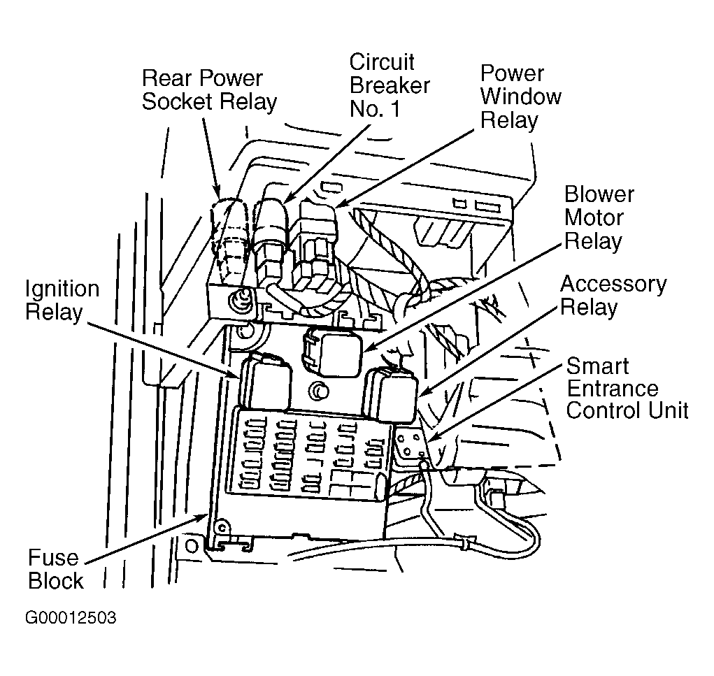 Power is supplied at all times from fusible link through a circuit breaker to power window relay. See Fig 1 . With ignition switch in ON or START position, power window relay is energized from fuse No. 11 (7.5-amp). When relay is energized, power is supplied to power window main switch terminal No. 1 (White wire) and all sub-switches at terminal No. 5 (White wire), and is applied to window motors by completing ground circuit. Power window motor operation is controlled by applying ground from main switch, through sub-switch (except driver's window) to power window motor. Power window lock switch disconnects all sub-switch ground circuits through the main switch, preventing passenger window motors from operating. Windows may be operated for up to 45 seconds after ignition is switched to OFF position.