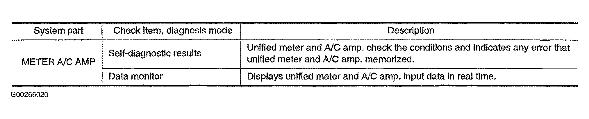CONSULT-II executes the following functions by combing data reception and command transmission via the communication line from unified meter and A/C amp. For self-diagnostic results and data monitor display, see Fig 1.