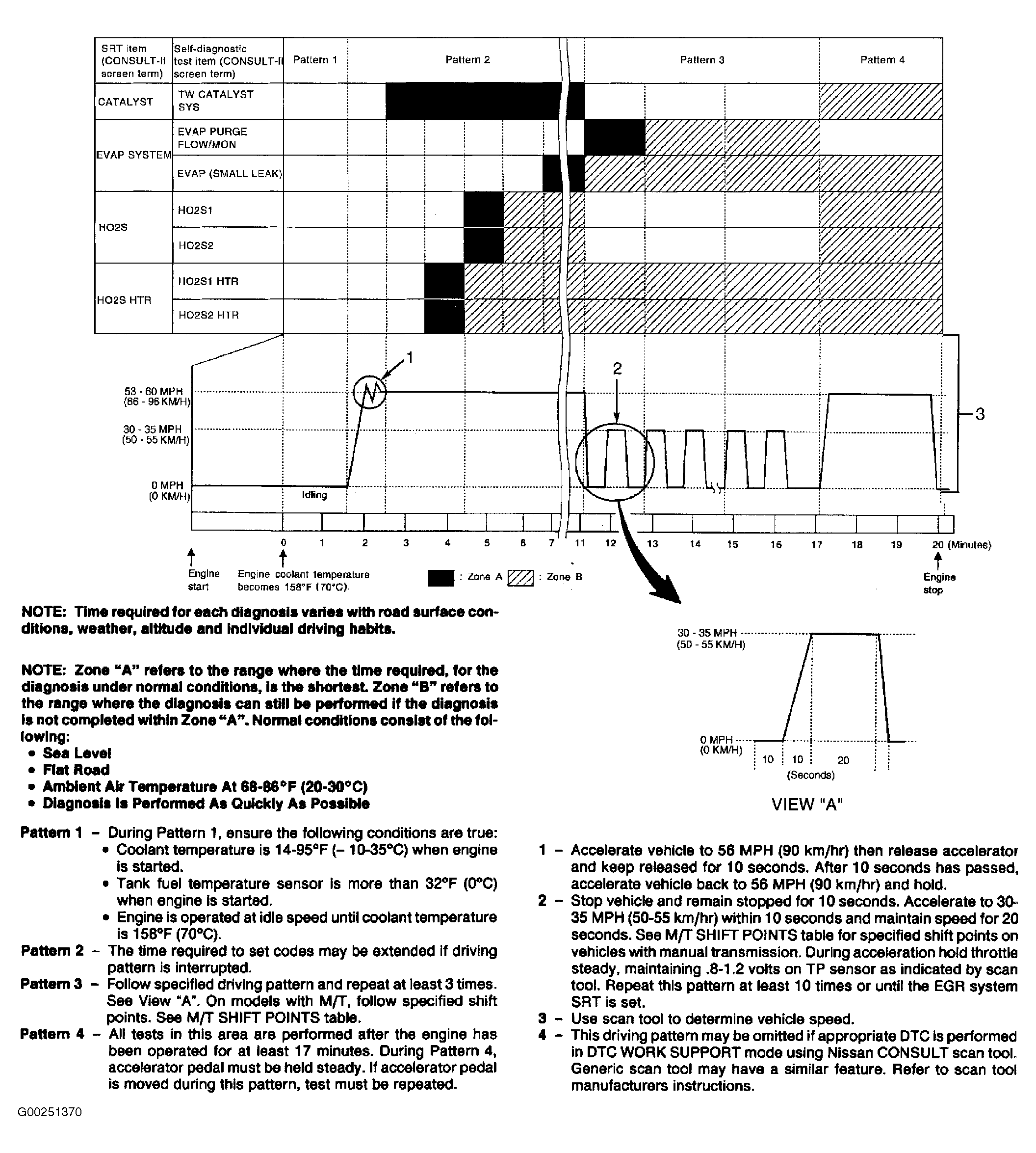 To set all SRT codes as complete, drive vehicle according to procedure shown in illustration. See Fig 1 . Perform driving procedure one or more times. If driving procedure is interrupted, repeat procedure. Operate vehicle with shift lever in "D" position and overdrive turned on.