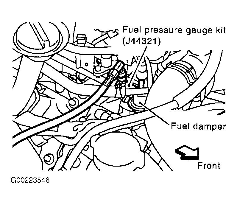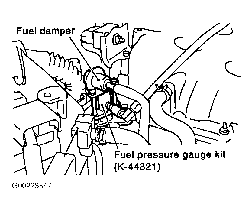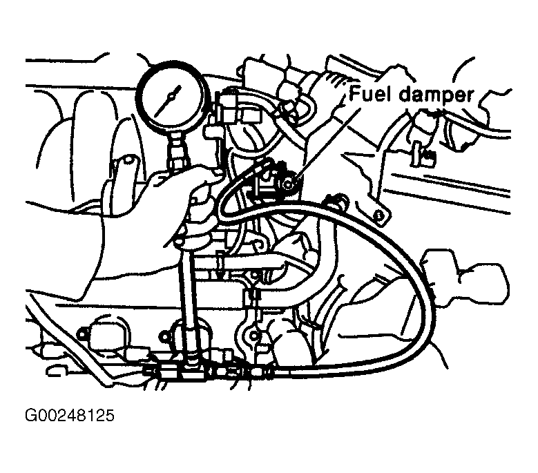 1. Release fuel pressure to zero. See FUEL PRESSURE RELEASE . Install the inline fuel quick disconnected fitting between fuel damper and injector tube. See Fig 1, Fig 2, Fig 3 or Fig 4 . Connect the fuel pressure test gauge (quick connector adapter hose) to the inline fuel quick disconnected fitting.