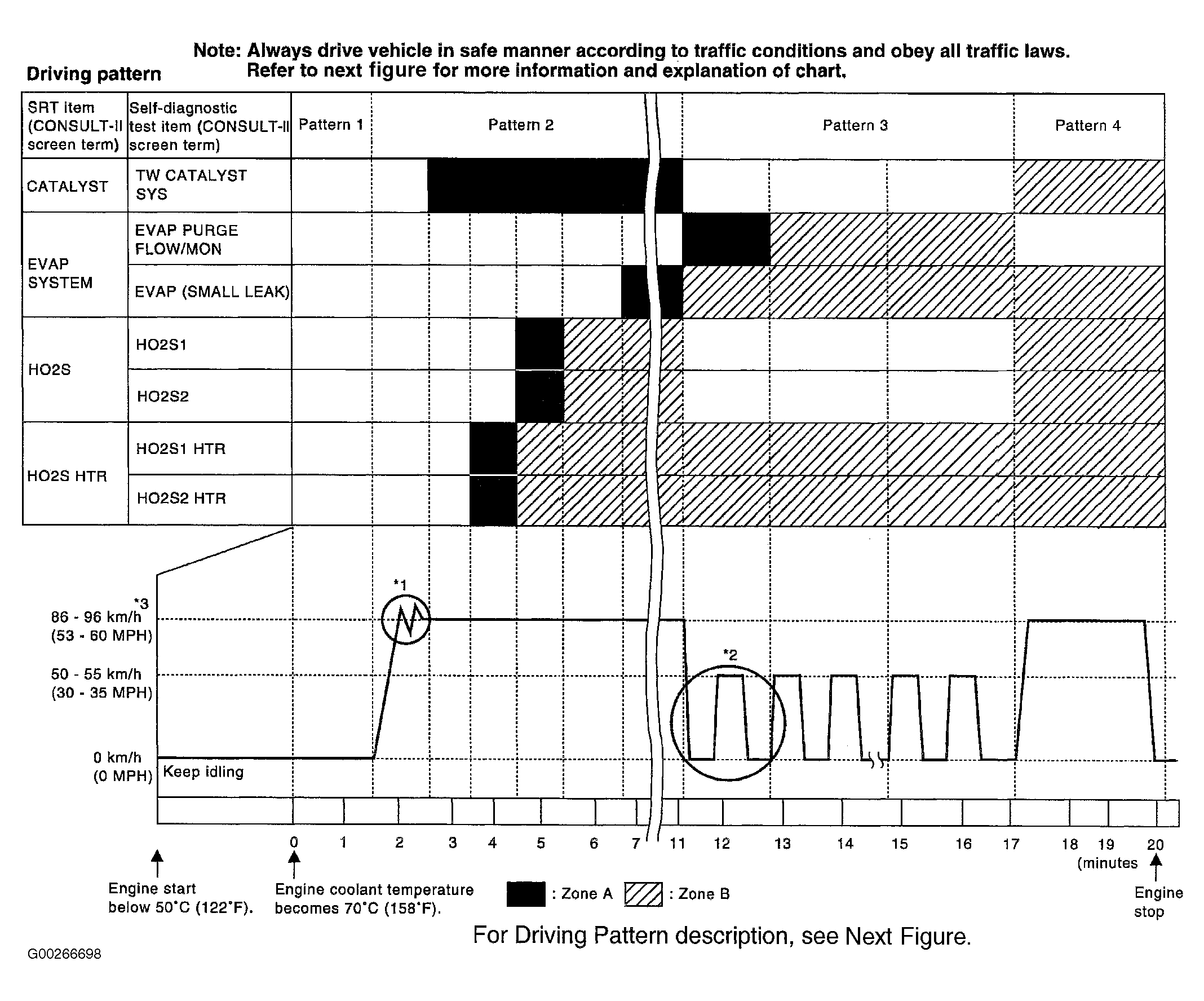 To set all SRT codes as complete, drive vehicle according to procedure shown in illustrations. See Fig 1 and Fig 2 . Perform driving procedure one or more times. If driving procedure is interrupted, repeat procedure. Operate vehicle with shift lever in "D" position and overdrive turned on.
