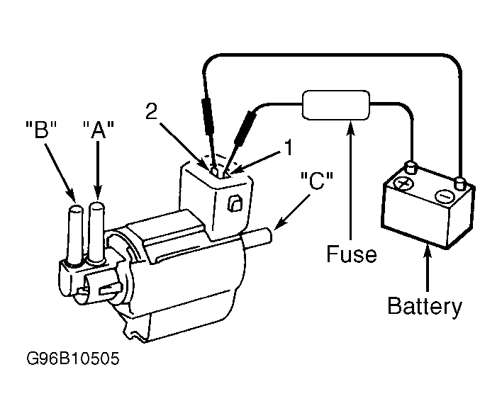 • With GST  - Check air passage continuity and operation delay time under the following conditions. If 12 volts is applied between terminals No. 1 and 2, air passage continuity between "A" and "B" should exist, and air passage continuity between "A" and "C" should not exist. See Figure. If no voltage is applied, there will be no air passage continuity between "A" and "B", but there will be air passage continuity between "A" and "C".