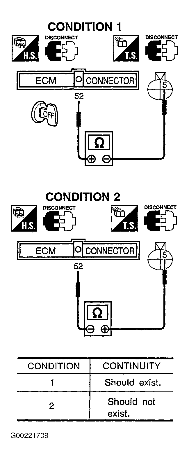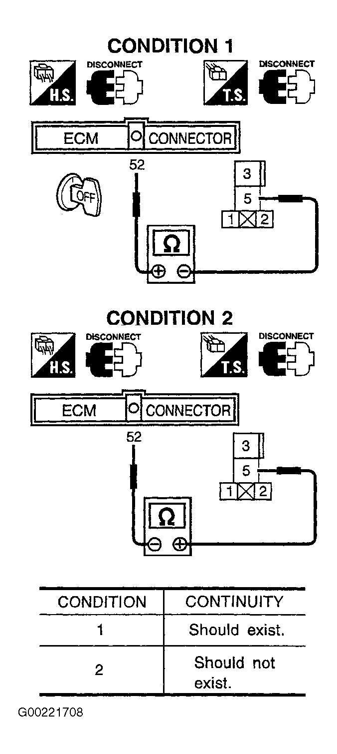 - Stop engine. Ensure ignition switch is in OFF position. Disconnect ECM harness connector. Disconnect headlight relay harness connector. See ENGINE PERFORMANCE in SYSTEM WIRING DIAGRAMS article in ELECTRICAL. Using ohmmeter, check continuity between ECM harness connector terminal No. 52 and LH headlight relay harness connector terminal No. 5. Ensure ohmmeter leads are correctly placed for both test conditions. See Fig 2. Also check harness for short to ground or short to power. If no problem is found, go to next step. If problem is found, go to step 10.
