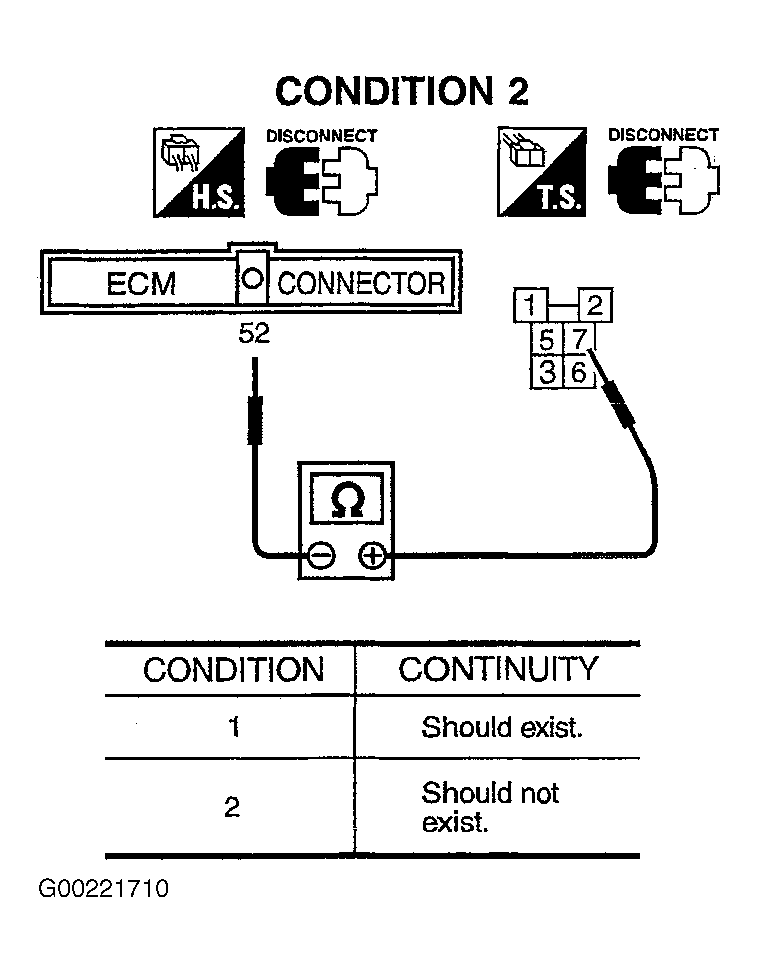 - Turn ignition switch to OFF position. Disconnect ECM harness connector. Disconnect rear window defogger relay. See ENGINE PERFORMANCE in SYSTEM WIRING DIAGRAMS article in ELECTRICAL. Using ohmmeter, check continuity between ECM harness connector terminal No. 52 and rear window defogger relay harness connector terminal No. 7. Ensure ohmmeter leads are correctly placed for both test conditions. See Fig 1. Also check harness for short to ground or short to power. If no problem is found, go step 6. If problem is found, go to next step.