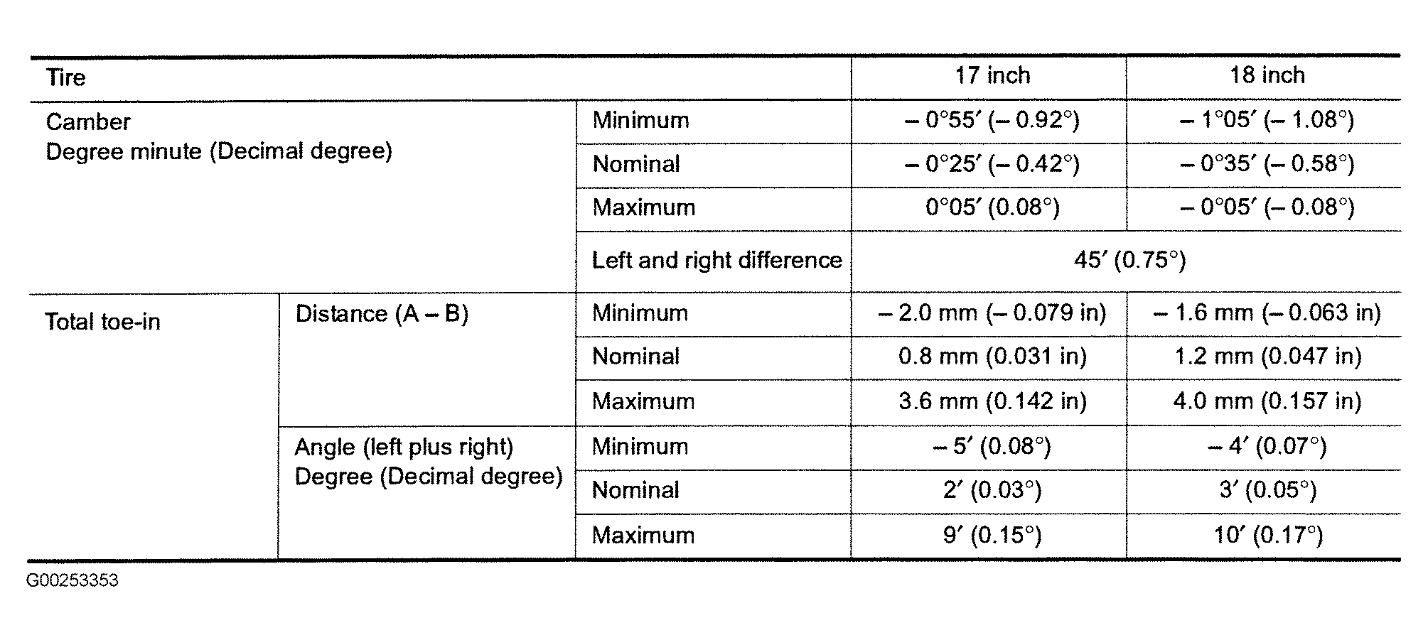 Use illustrations for front and rear wheel alignment specifications. See