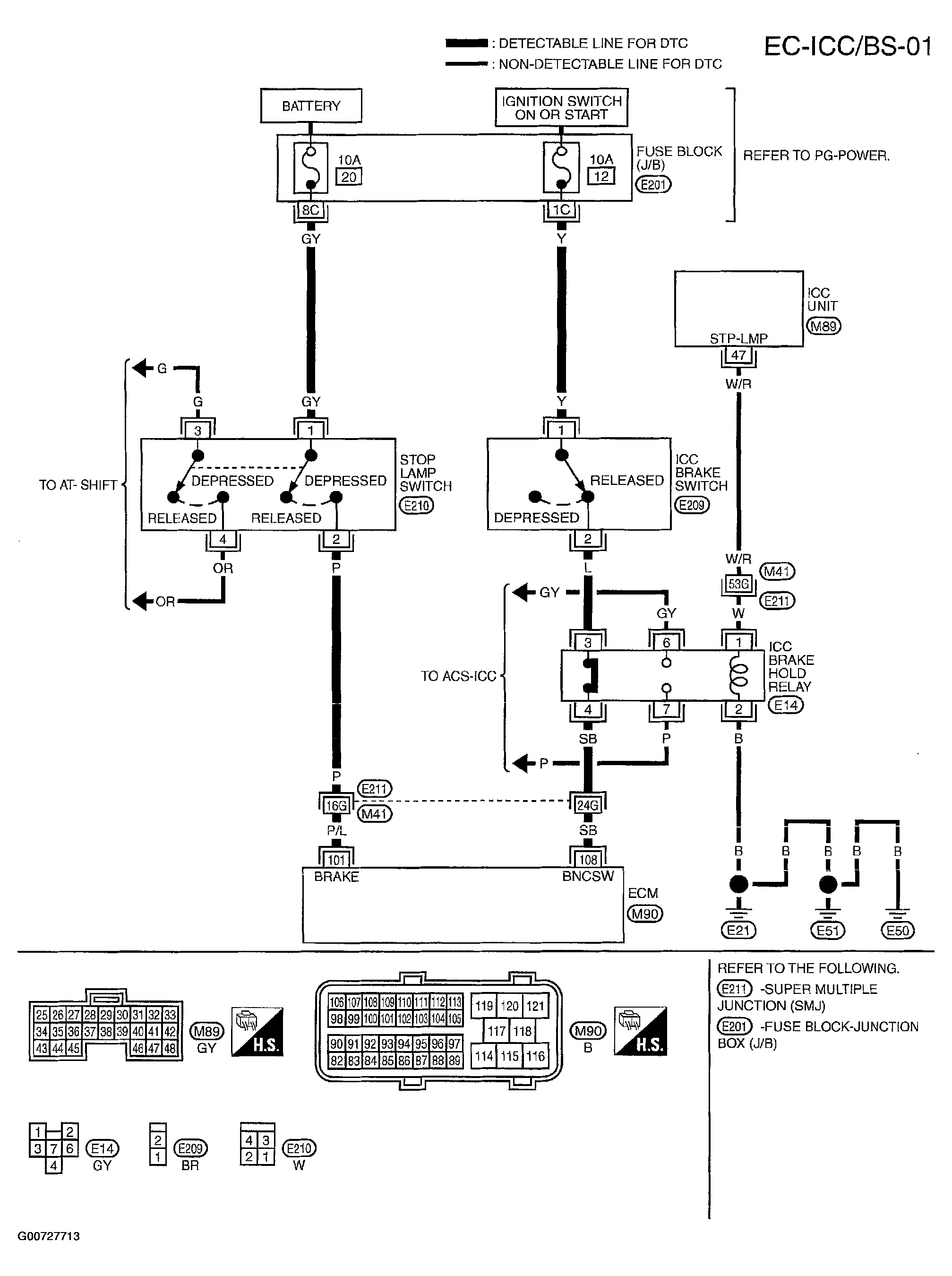 - Check harness continuity between ICC brake hold relay terminal 4 and ECM terminal 108.