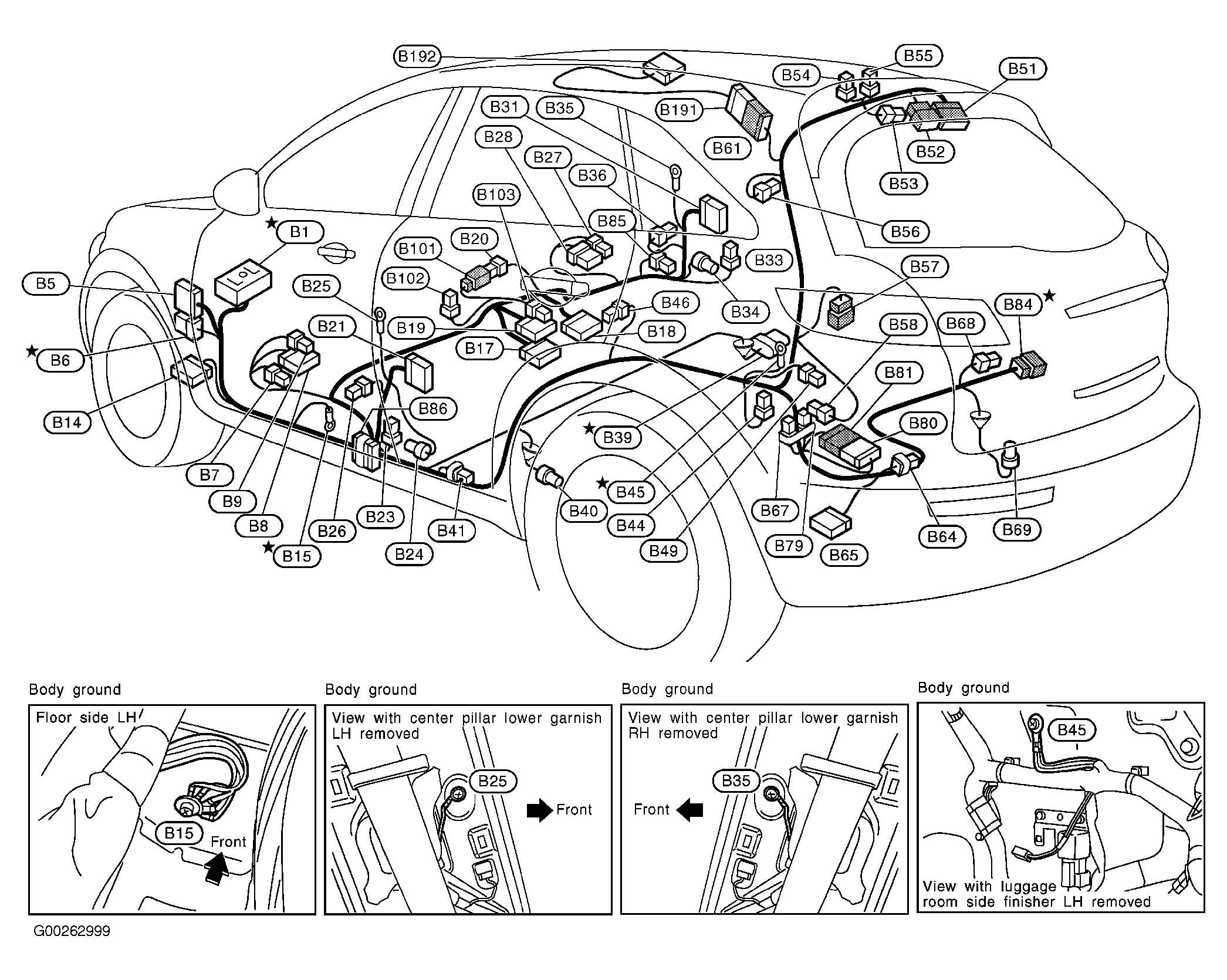 | Left Side Curtain Air Bag Module (B54) | At left "C" pillar. See Figure . |