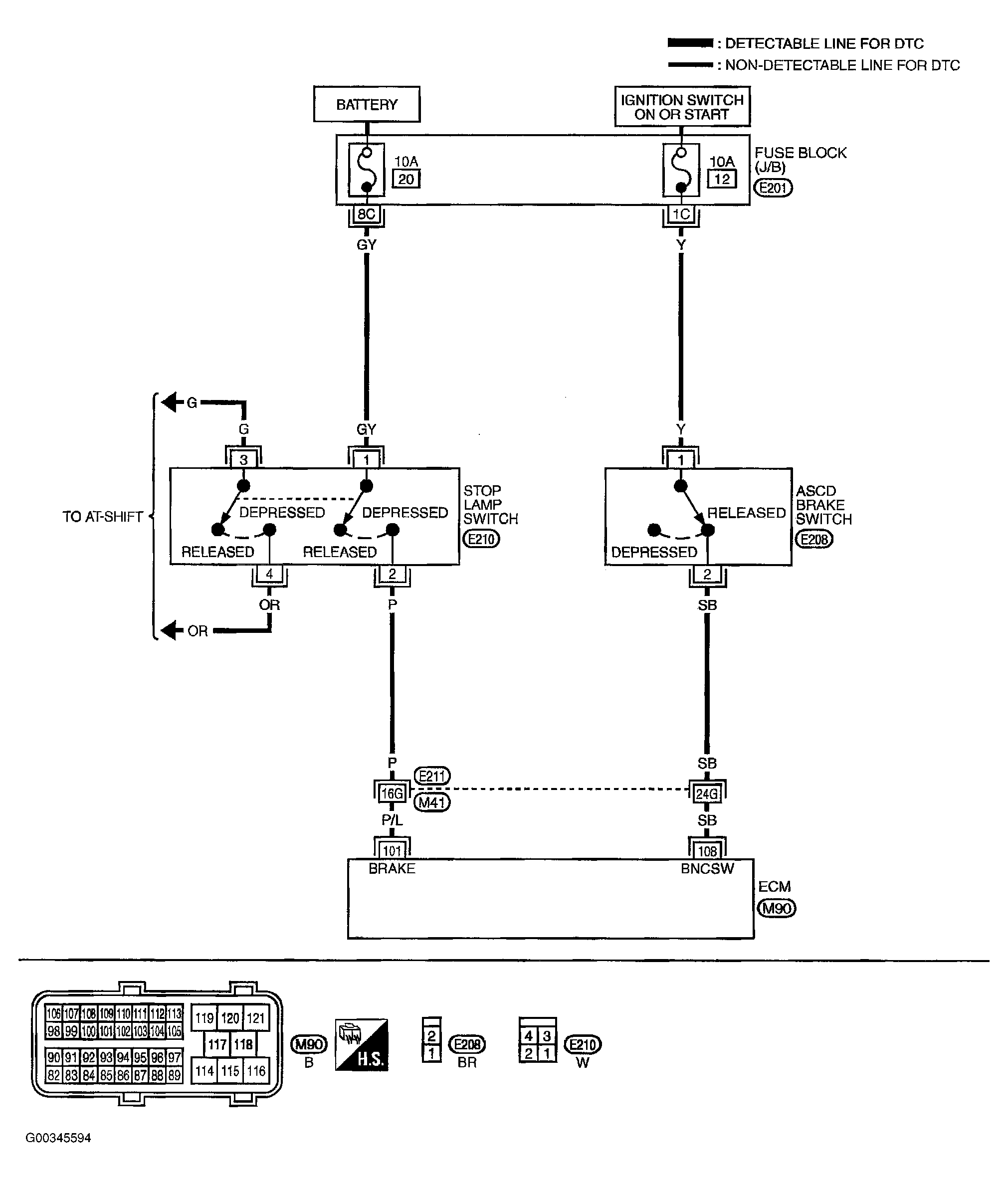 - Check harness continuity between ECM terminal 108 and ASCD brake switch terminal 2. Refer to wiring diagram. See Figure
