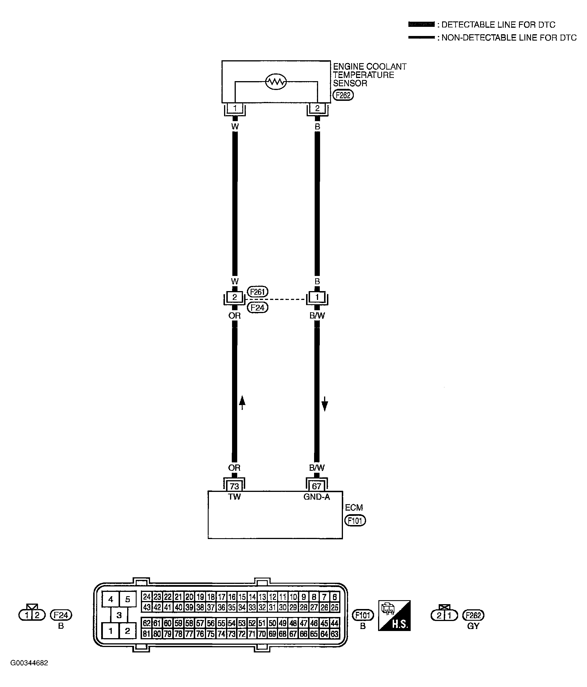 - Check harness continuity between ECT sensor terminal 2 and ECM terminal 67.
