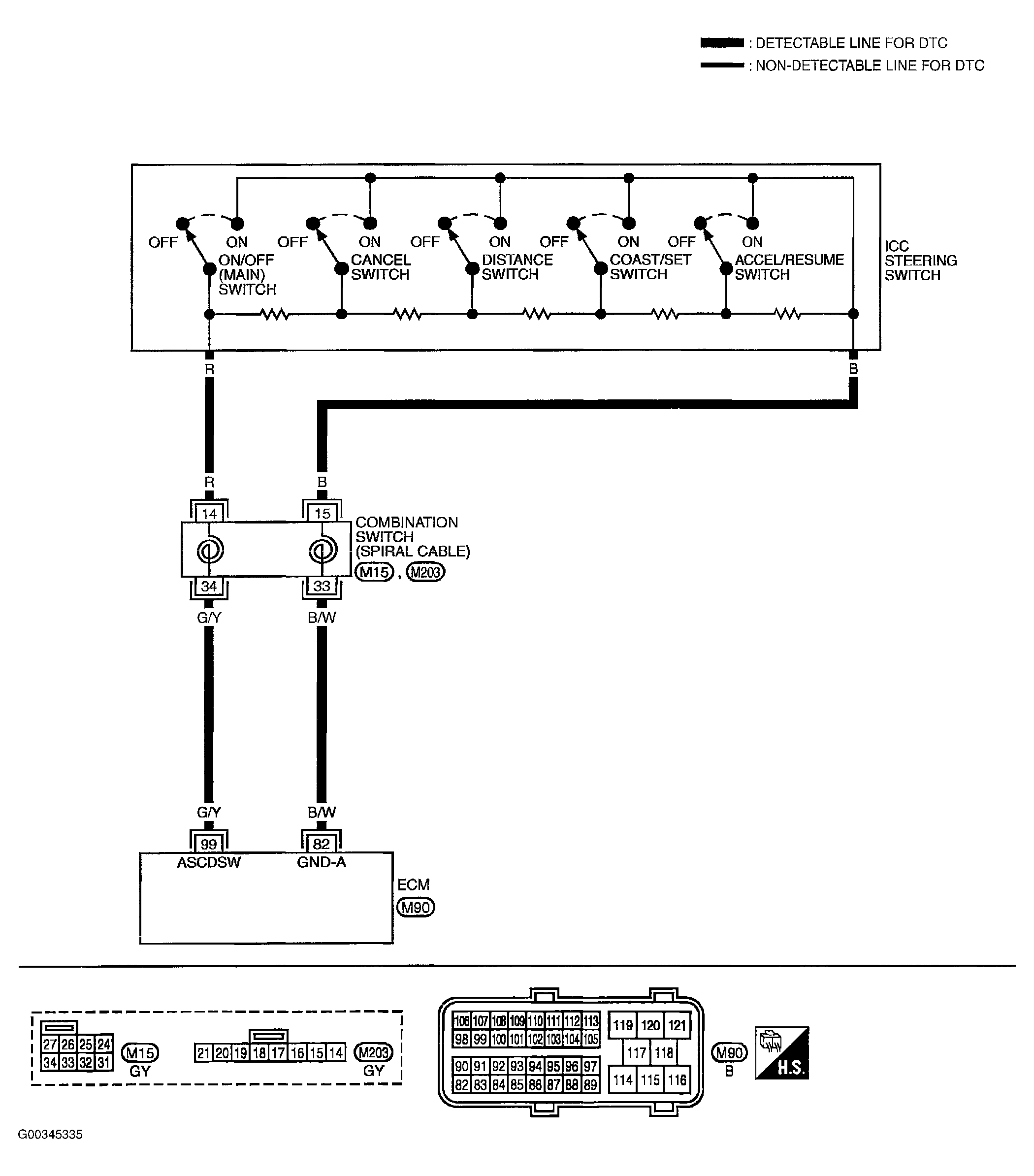 - Check harness continuity between ECM terminal 99 and combination switch terminal 14.