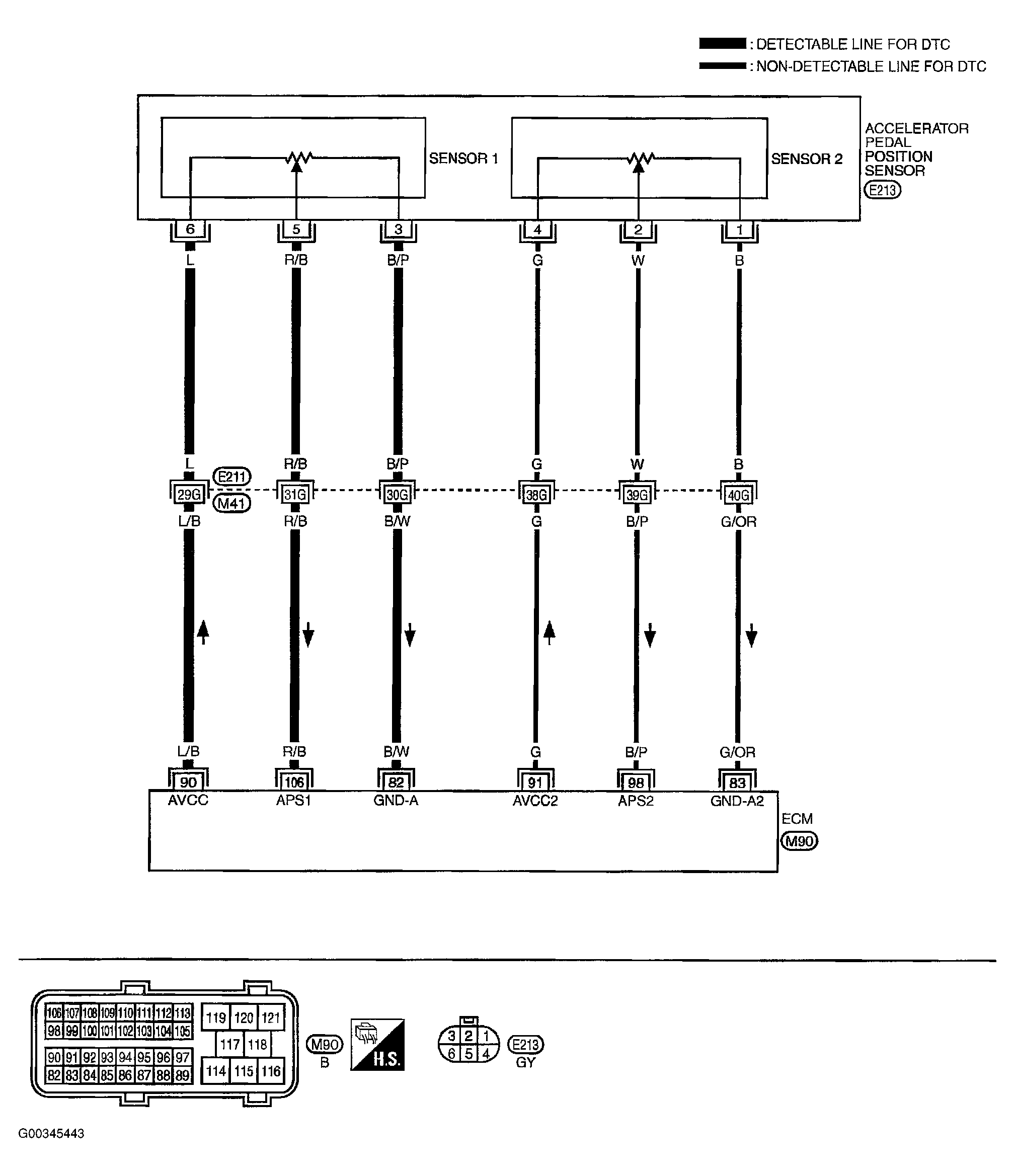 - Check harness continuity between ECM terminal 106 and APP sensor terminal 5.