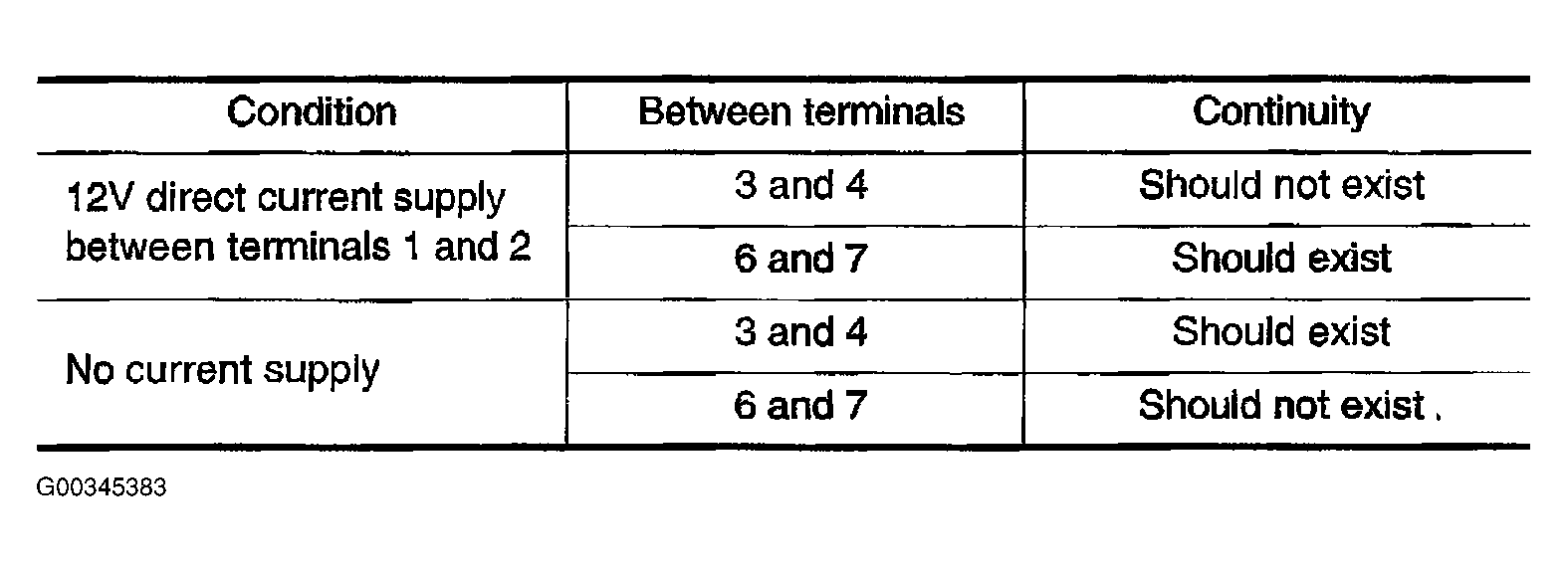 Check continuity between relay terminals 3 and 4, 6 and 7 under the following conditions. See