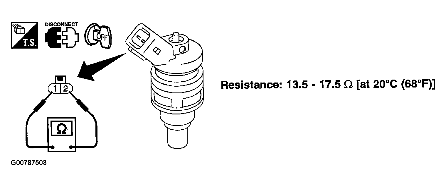 3. Check harness continuity between injector terminal 2 and ECM terminals 2, 11, 13, harness connector F58 terminals 6, 2, 1 and ECM terminals 1, 3, 12.