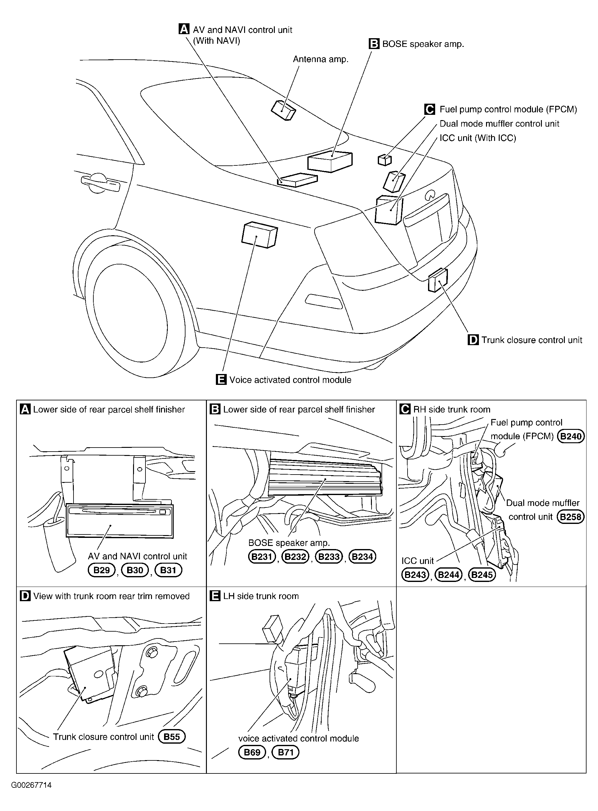 | AV & NAVI Control Unit | At front center of luggage compartment. See Figure . |