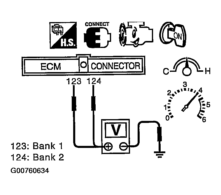 - Set voltmeter probes between ECM terminal 123 [HO2S2 (B1) signal] or 124 [HO2S2 (B2) signal] and ground. See Figure.