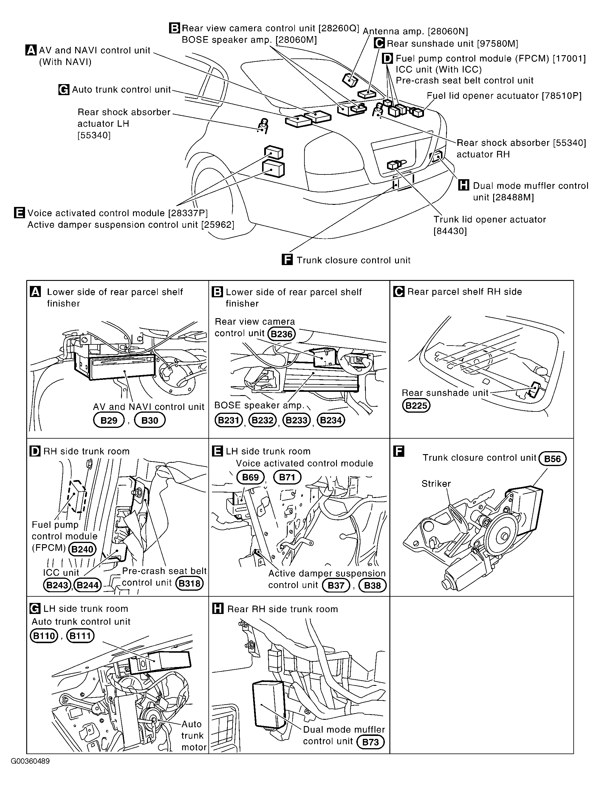 | AV & NAVI Control Unit (W/NAVI) | Under left side of rear parcel shelf. See Figure . |