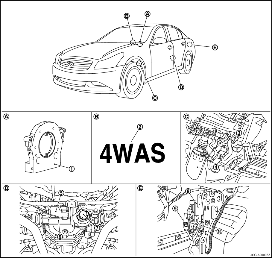 | 4WAS Main Control Unit (E-8) | Left side of luggage compartment. See Figure. |