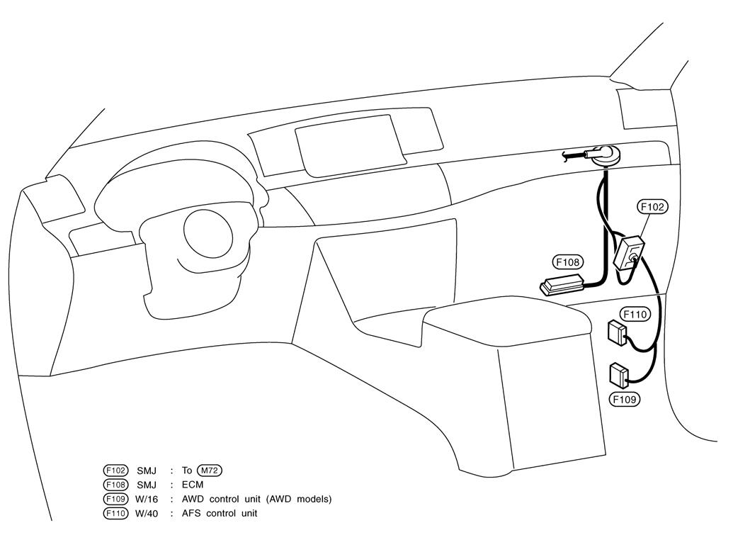 | AWD Control Unit (F109) | Behind right kick panel. See Figure. |
