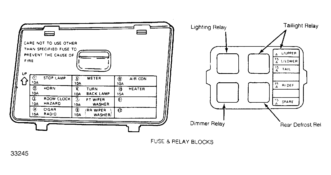 | Fuse & Relay Blocks | Under left side of dash and in engine compartment. See Figure & Figure . |
