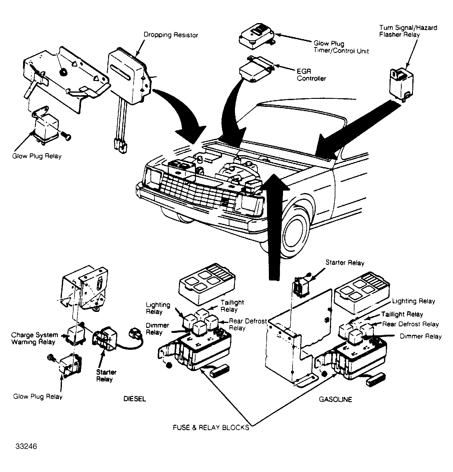| Dropping Resistor (Diesel) | On right side of firewall. See Figure . |
