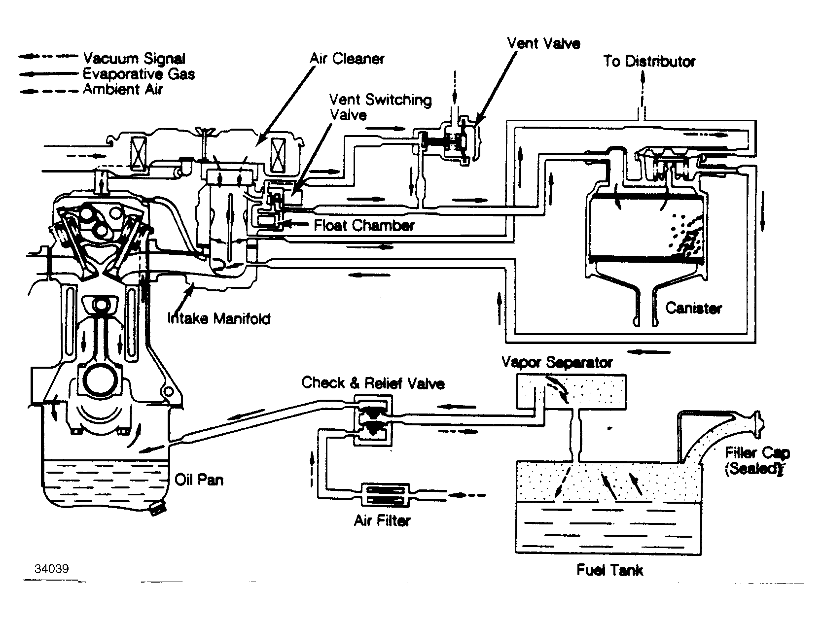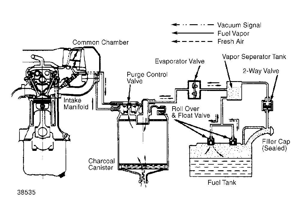 System is designed to route fuel vapors from fuel tank and carburetor into carbon canister where they are stored until intake vacuum draws vapor into combustion chambers for burning.