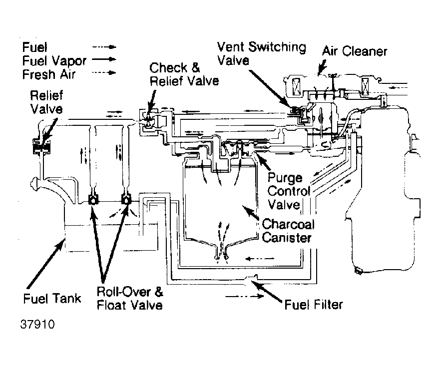 System components vary by model. See Fig 1 , Fig 2 , and Fig 3 . Components include a sealed filler cap, vapor separator, check and relief valve, canister and purge control valve, vent valve, vent switching valve (solenoid operated), relief valve, roll-over and float valve, 2-way valve, and connecting lines and hoses.