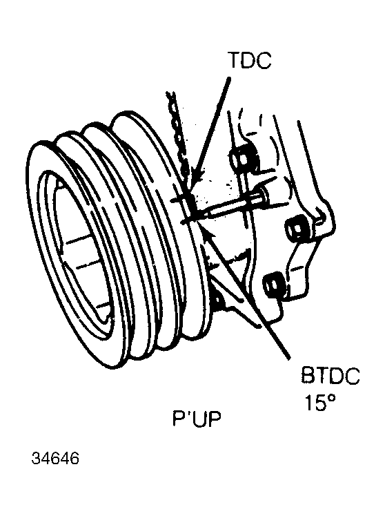 - Turn engine until No. 1 cylinder is 45-60 degrees BTDC. Set dial indicator to zero. Turn crankshaft pulley slightly in both directions and ensure zero reading does not change.