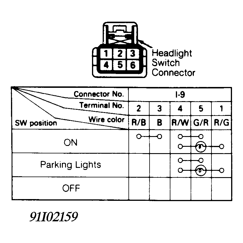 - Disconnect headlight switch connector. Check continuity at headlight switch connector terminals as shown in table. See Fig 1 .