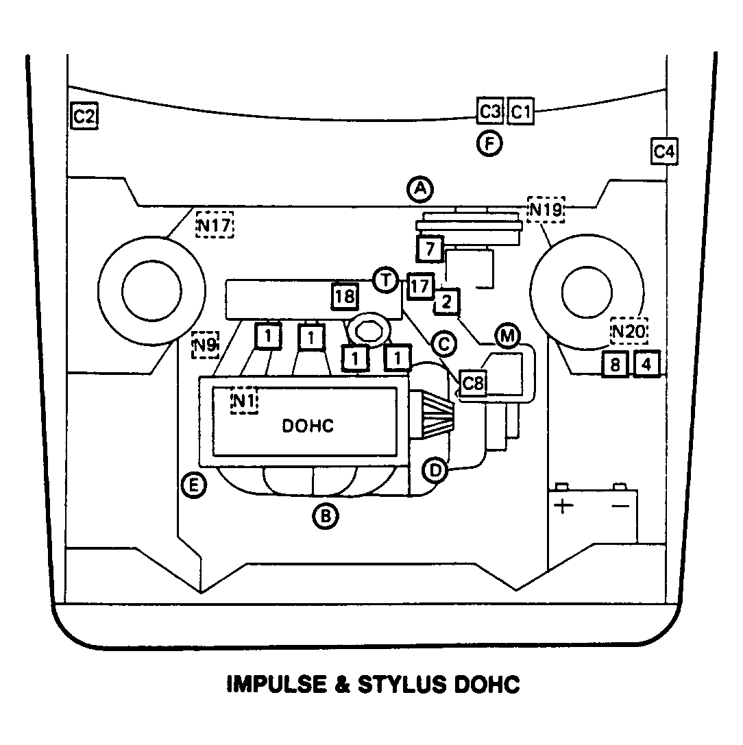 | Impulse & Stylus DOHC | On left side of engine compartment, near strut tower. See Figure . | ||