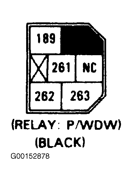 - Remove power window relay (located in fuse box at left side of instrument panel). Using an ohmmeter, check continuity between relay terminals No. 261 and 263 (Brown/White wires). See Figure . See WIRING DIAGRAMS . Continuity should not exist.