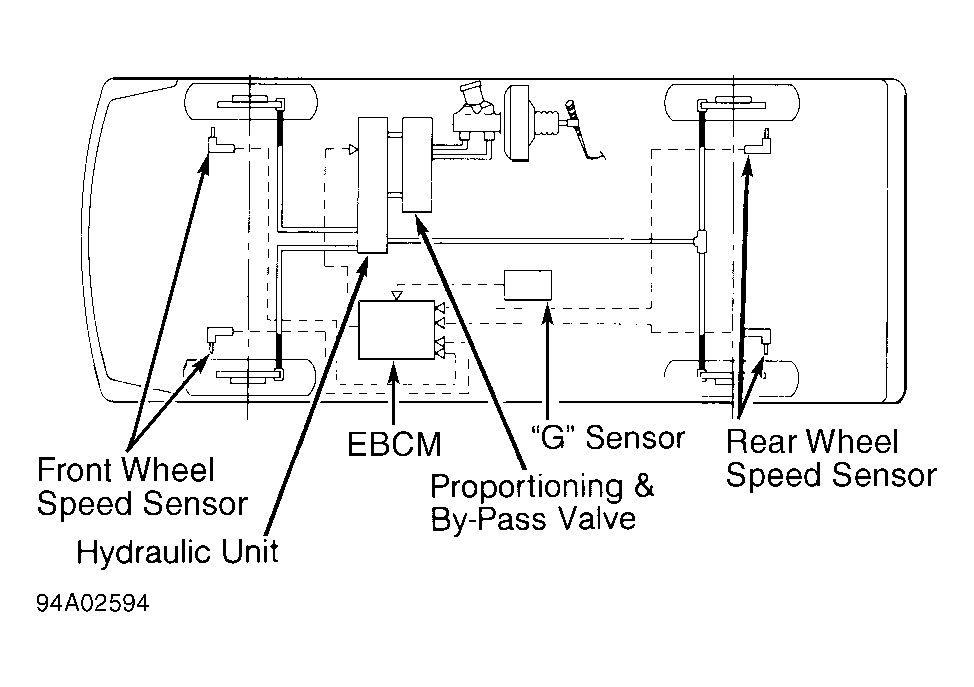 The optional Anti-Lock Brake System (ABS) operates on all 4 wheels. Wheel speed sensor and Electronic Brake Control Module (EBCM) can determine when a wheel is about to lock and adjust hydraulic pressure to maintain optimum braking. ABS system consists of an EBCM, "G" sensor, hydraulic unit, warning light and 4-wheel speed sensors. See Fig 1 .