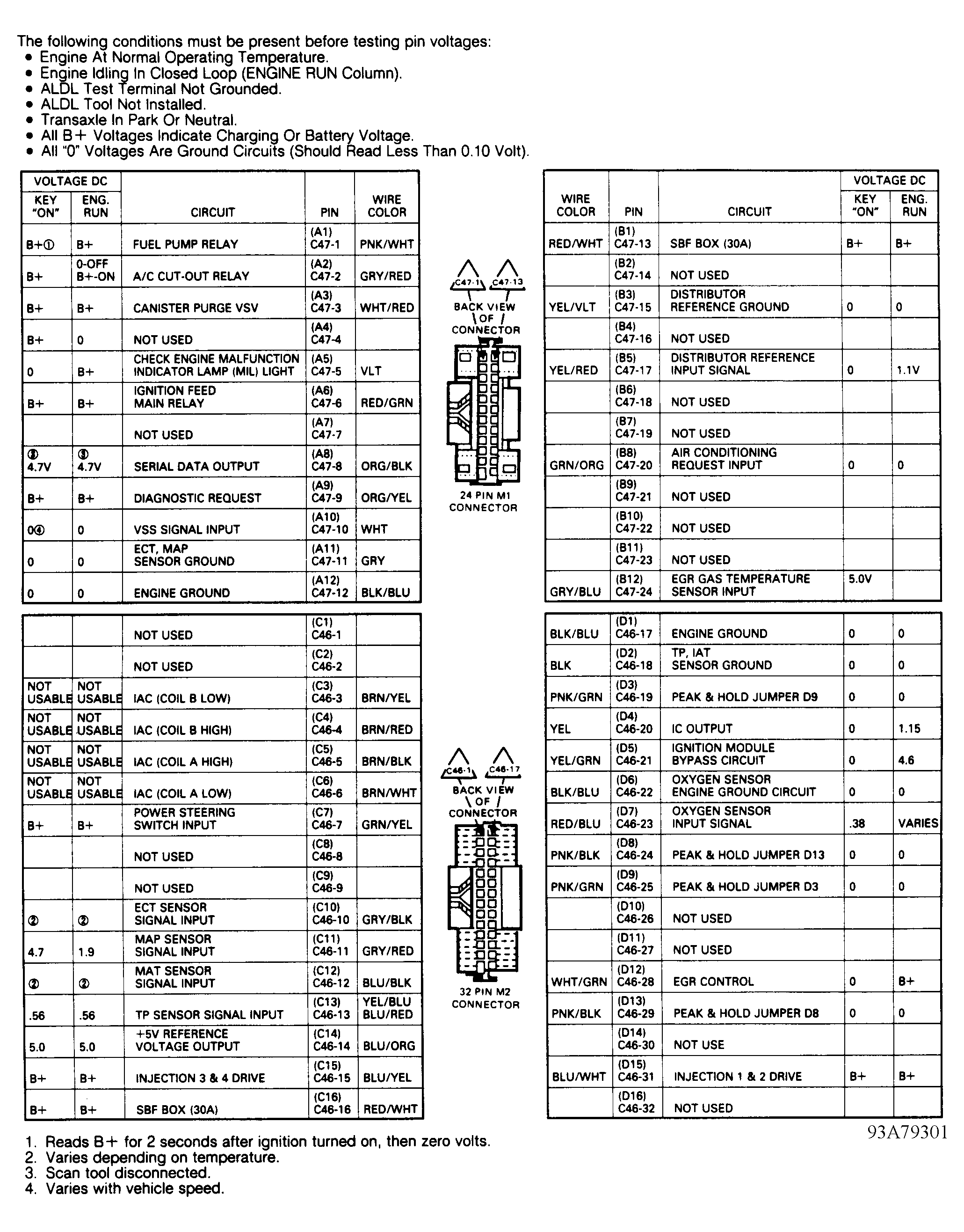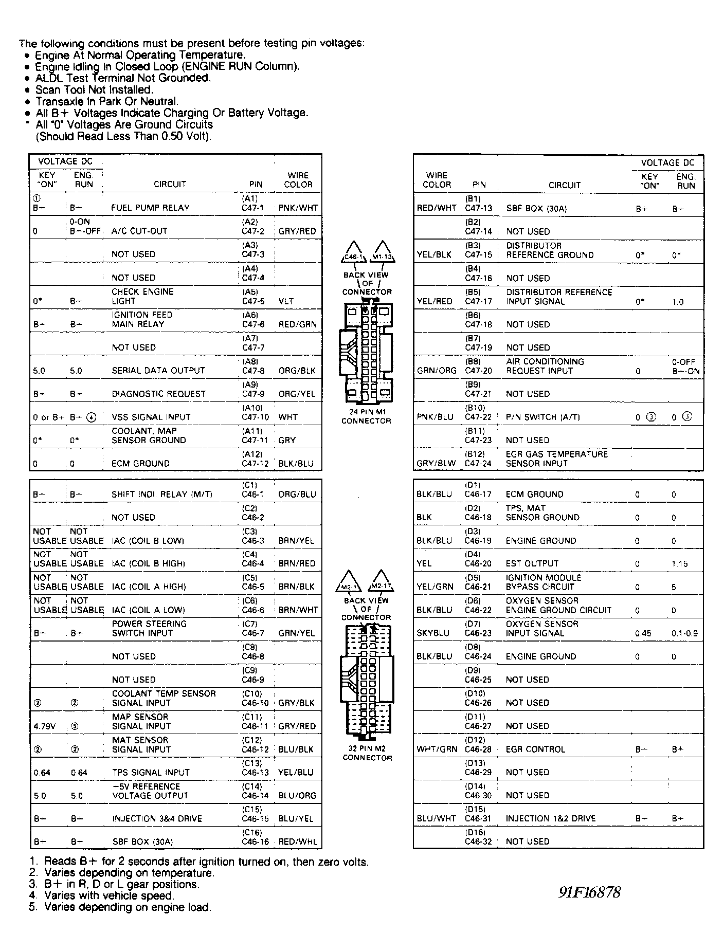 Courtesy of ISUZU MOTOR CO. ECM CONNECTOR A-B (24 PIN) TERMINAL PIN VOLTAGE (1.6L SOHC)
