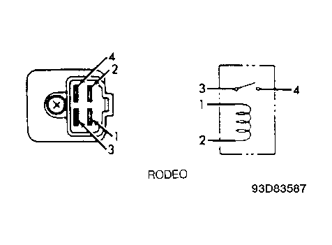 Remove power window relay (located behind right side kick panel). Using an ohmmeter, check continuity between relay terminals No. 3 and 4. SeeFig 1 . Continuity should not exist. Apply battery voltage to terminal No. 1. Ground terminal No. 2. Continuity should exist between terminals No 3 and 4. If relay does not test as described, replace relay.