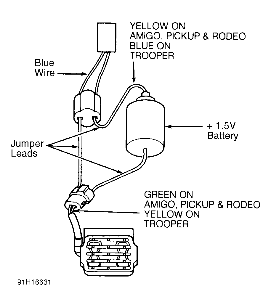 - Connect jumper wire between harness connector and power transistor connector Blue wire terminal. Connect negative end of 1.5-volt "D" battery to power transistor Green wire terminal. See Fig 1